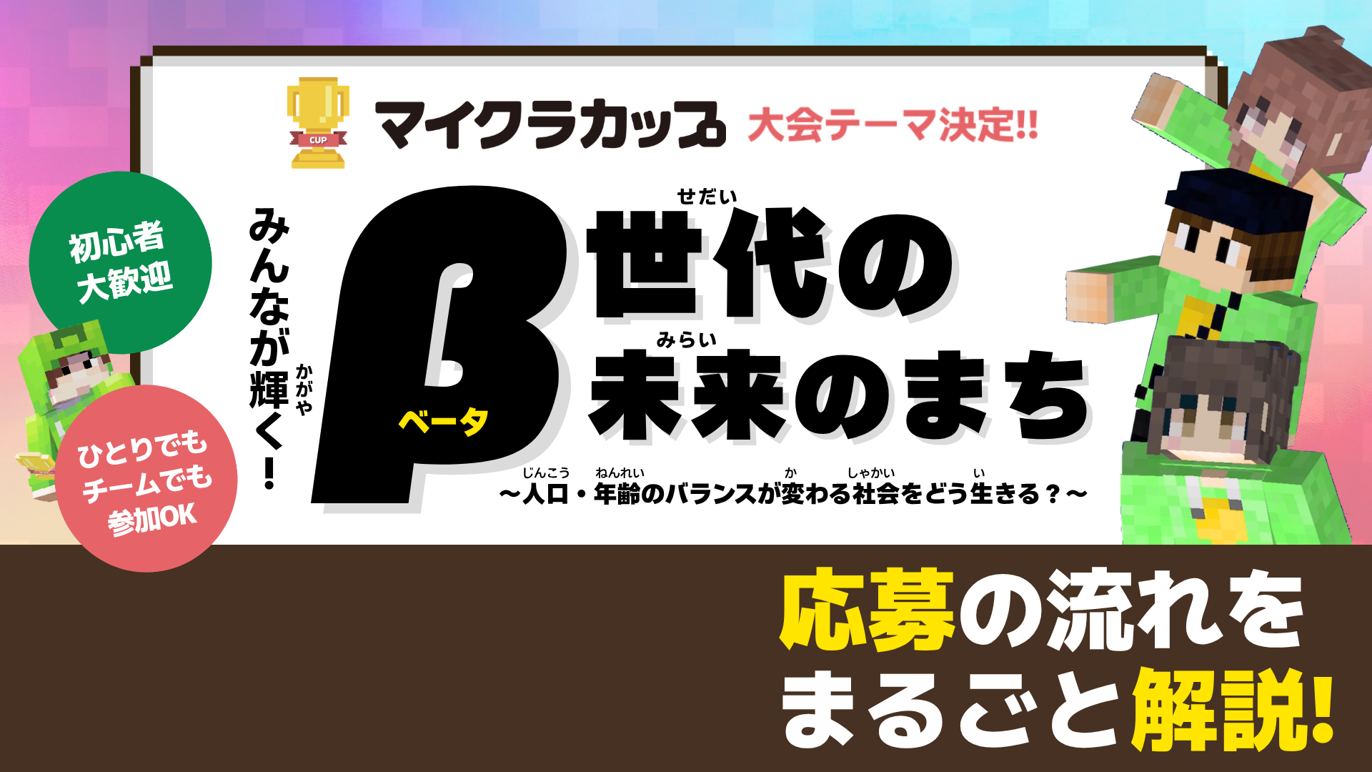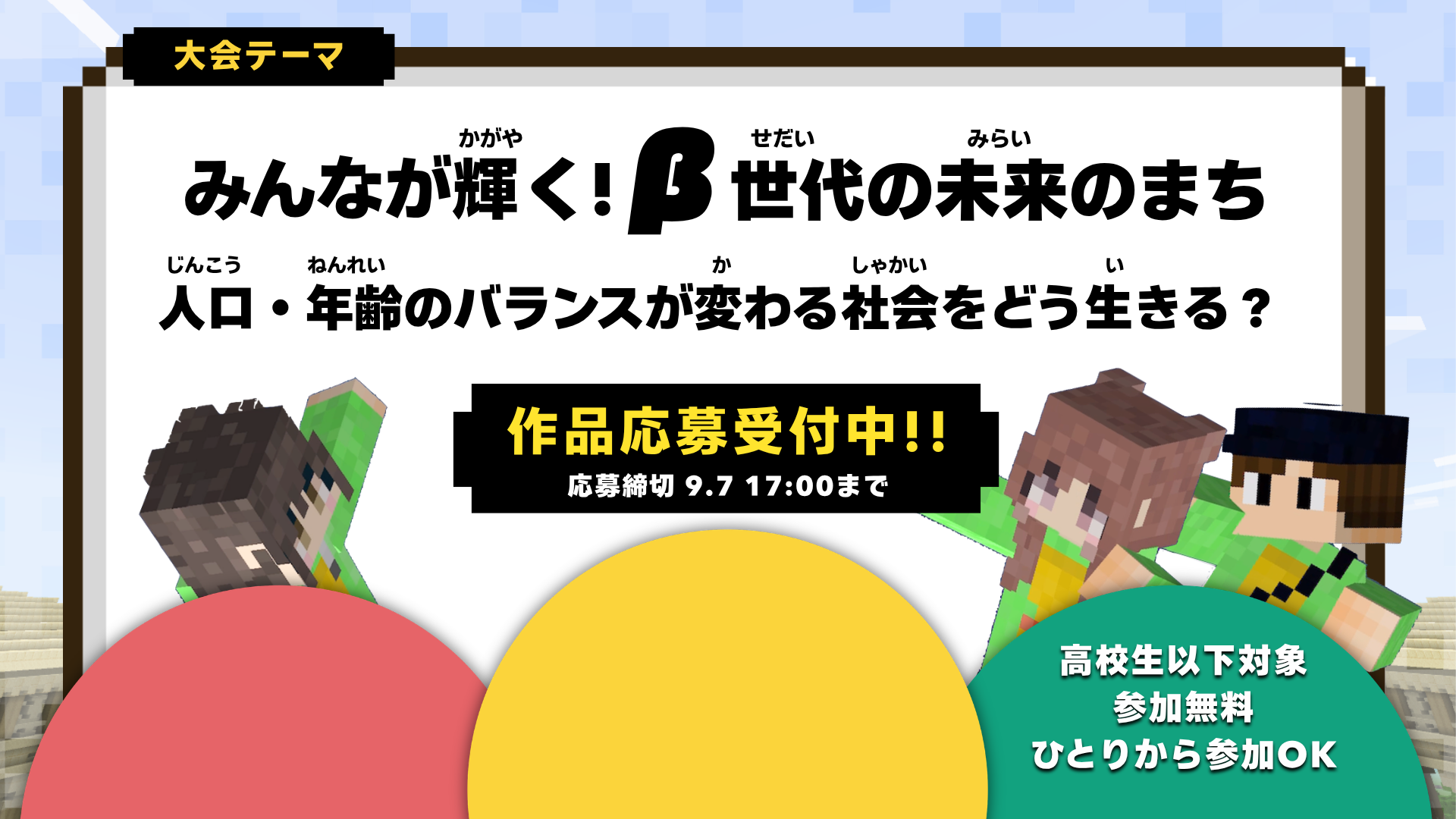 高校生以下の子どもたちが「教育版マインクラフト(Minecraft Education)」を使って、大会テーマに沿った作品をつくるデジタルものづくりの大会です。