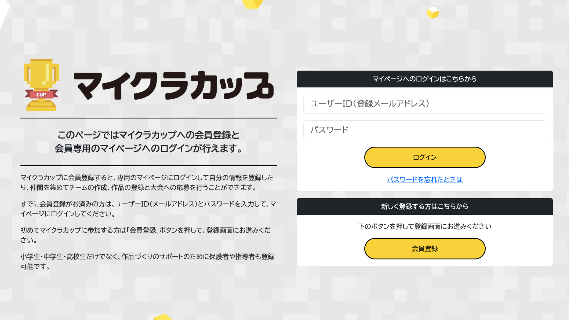 まずは、大会公式サイトで無料の会員登録を行います。1人でもチームでも参加できます。会員登録をするとマイページがつくられ、過去作品のマイクラワールドがダウンロードできたり、作品の応募ができるようになります。