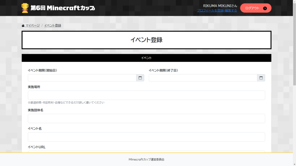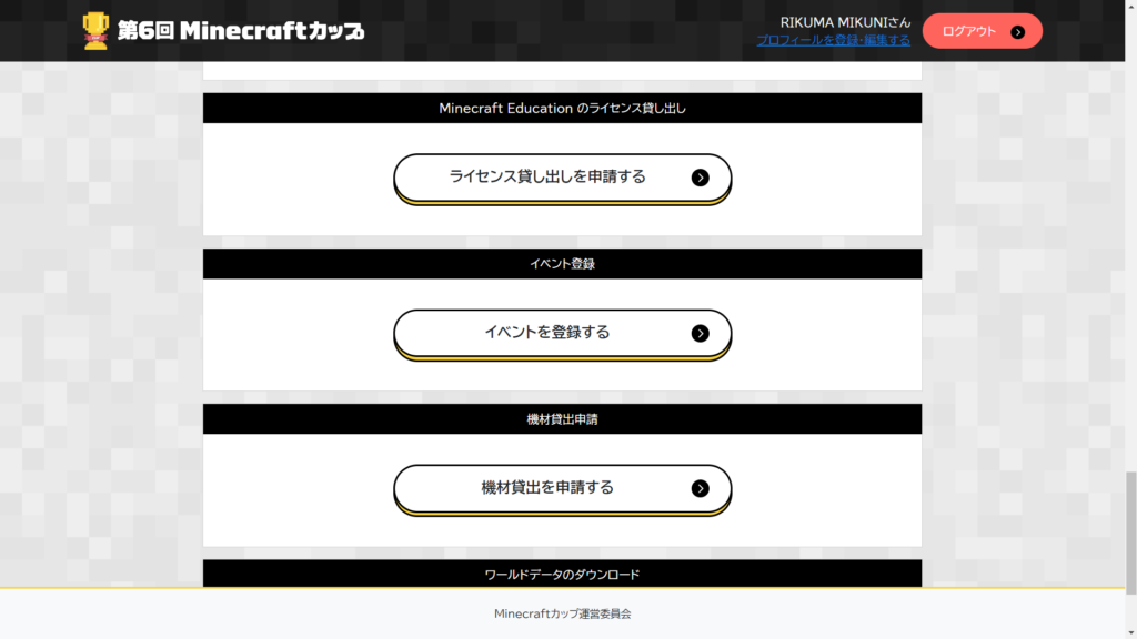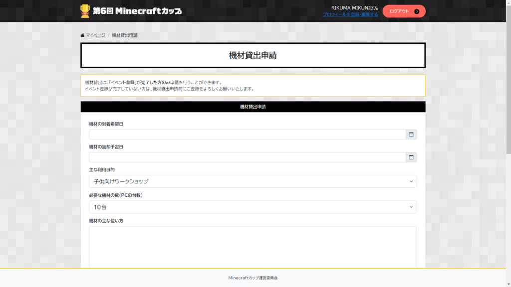Minecraftカップへの登録と、ガイドラインの確認が完了した後は、マイページにアクセスし、「イベントを登録する」や「機材貸出申請」のフォームから必要な情報を入力してください。
