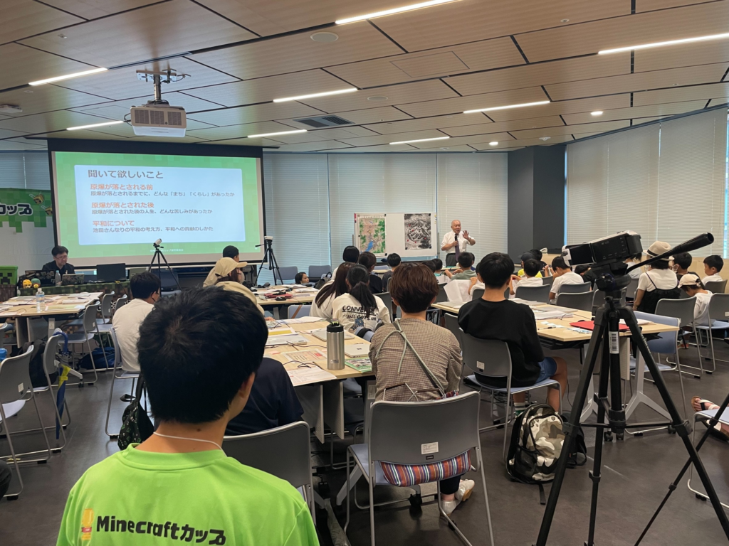 原爆投下日の8月9日を迎えるにあたり、世界の子どもたちに支持されている「Minecraft」を通して長崎の歴史について理解を深めるワークショップイベントでは、当時の写真を見ながら、被爆前の街並みを確認し、教育版マインクラフトを使って当時の街並みを再現しました。