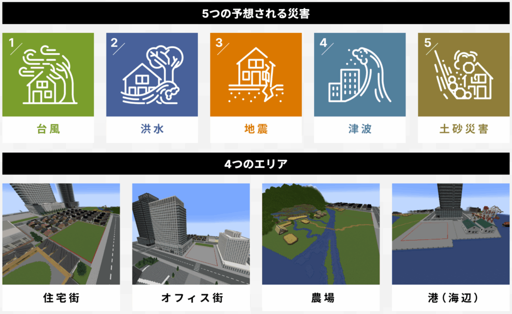 たてもの部門では、大会オリジナルの「防災ワールド」を使用。「台風、洪水、地震、津波、土砂災害」の5つの災害が起こることが想定され、人々が生活や仕事を行う4つのエリア「住宅街、オフィス街、農場、港(海辺)」があります。参加者は、4つのエリアから1箇所を選択し、その被害や防災対策について考えました。