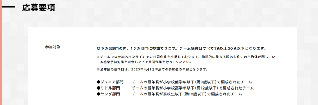 ▽以下の3部門の内、1つの部門に参加できます。チーム編成はすべて1名以上30名以下となります。