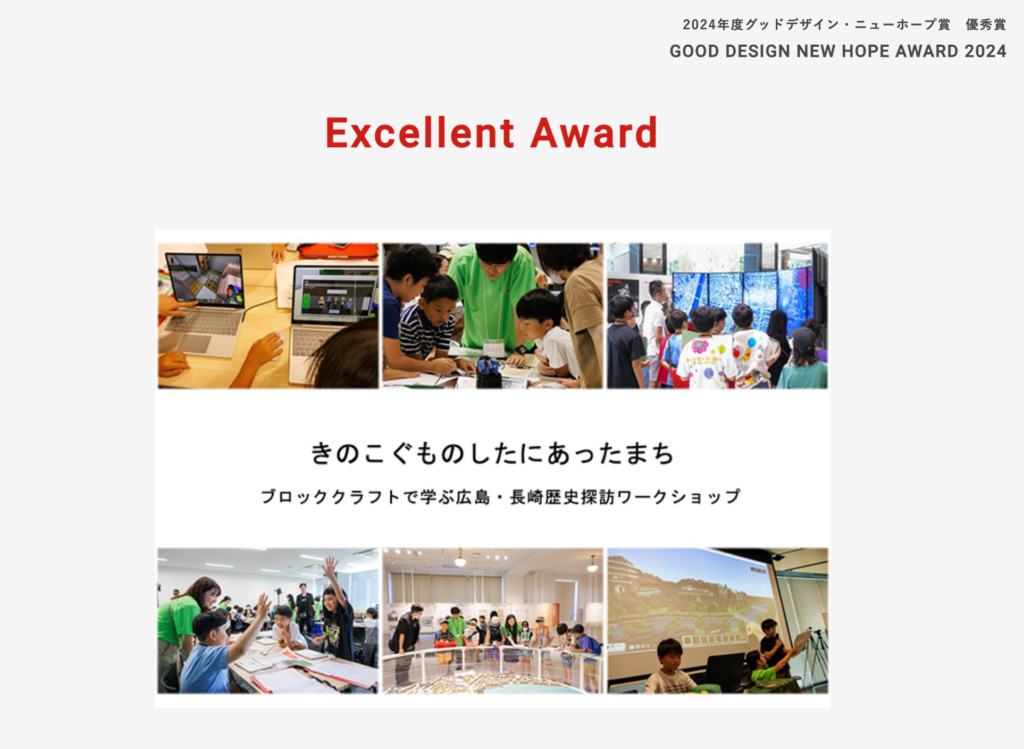 Minecraftカップが、東京大学大学院 渡邉研究室・藤本研究室らとともに、企画・開催した広島・長崎マイクラ平和ワークショップ「きのこぐものしたにあったまち −ブロッククラフトで学ぶ広島・長崎歴史探訪ワークショップ−」が、2024年度グッドデザイン賞・ニューホープ賞 優秀賞を受賞しました。