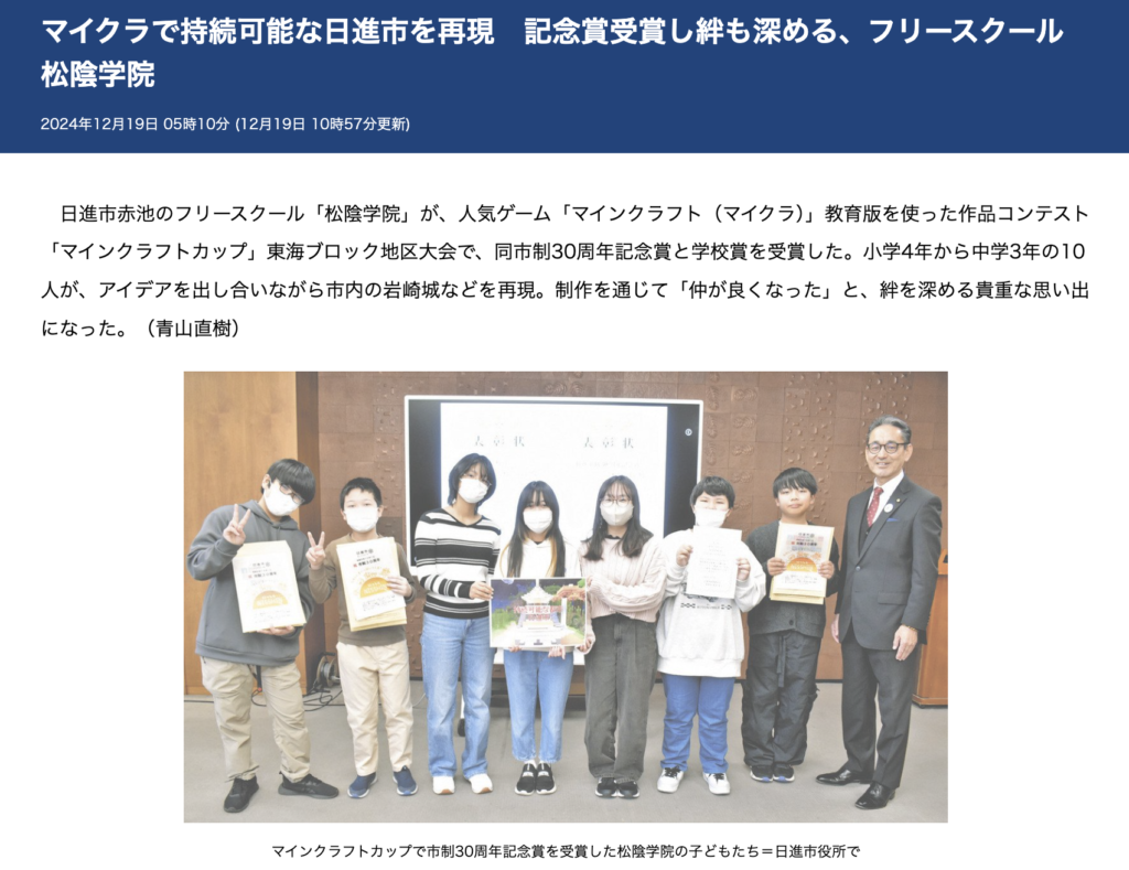 マイクラで持続可能な日進市を再現 記念賞受賞し絆も深める、フリースクール松陰学院
