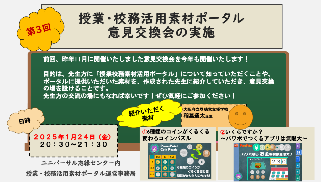 1月24日に、オンラインで「授業・校務活用素材ポータル意見交換会」を実施します。