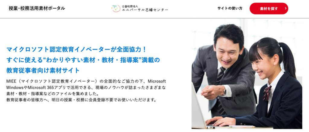 教育従事者の皆様が質の高い教育活動を効率的に実現するために、Microsoft WindowsやMicrosoft 365を活用した“わかりやすい素材・教材・指導案”を、素早く見つけて手軽に活用していただくことを目的とした、会員登録不要の素材データ専門サイトです。