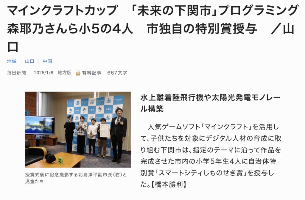マインクラフトカップ 「未来の下関市」プログラミング 森耶乃さんら小5の4人 市独自の特別賞授与 /山口