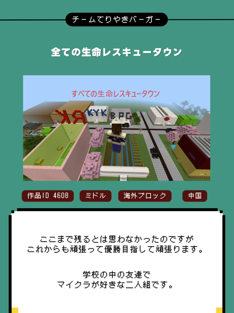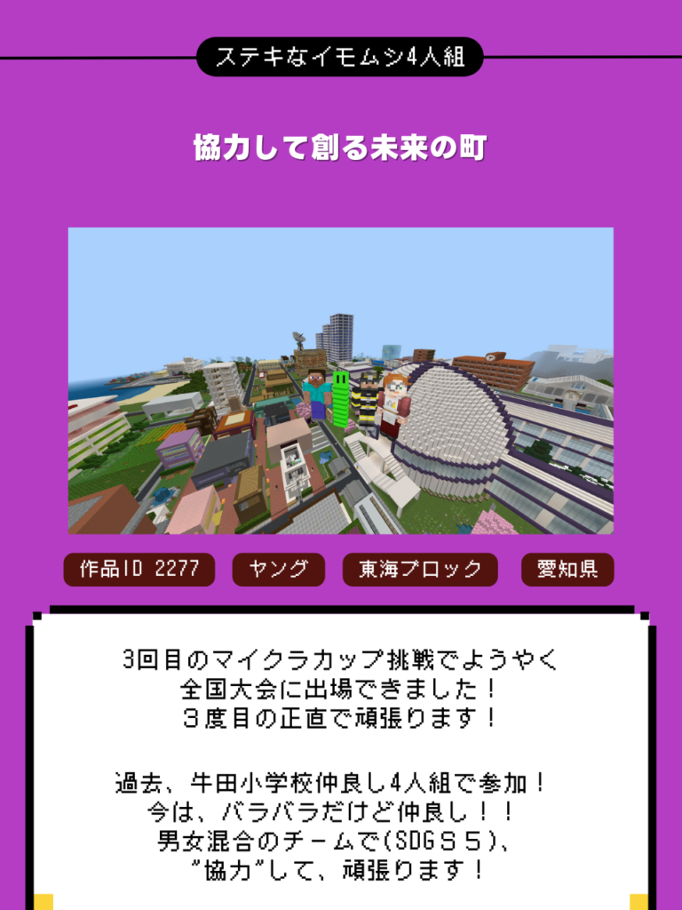 さて、本日は第6回Minecraftカップ全国大会 まちづくり部門最終審査に進出したファイナリスト28チームを紹介します。