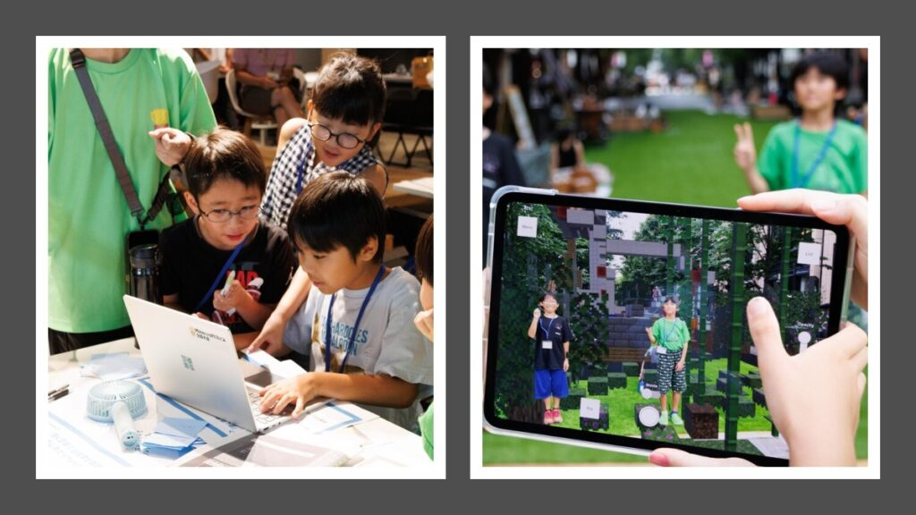 公園の遊具づくりや自然エネルギーなど、地域オリジナルのテーマについて考え、チームで協力してアイデアを出し、マイクラを使って表現するワークショップ(PBLや探究学習)を協同制作します。