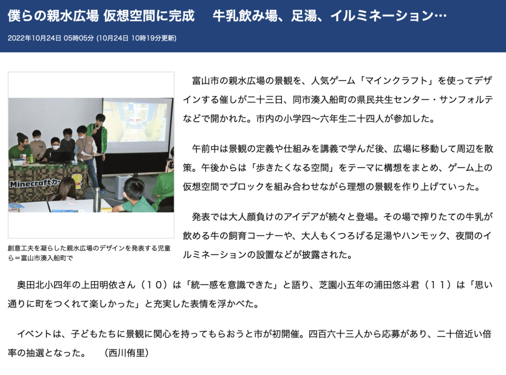 10/23(日)に富山市で小学校4〜6年生を対象に、Minecraftを使った景観まちづくりワークショプ(以下:WS)を開催しました。