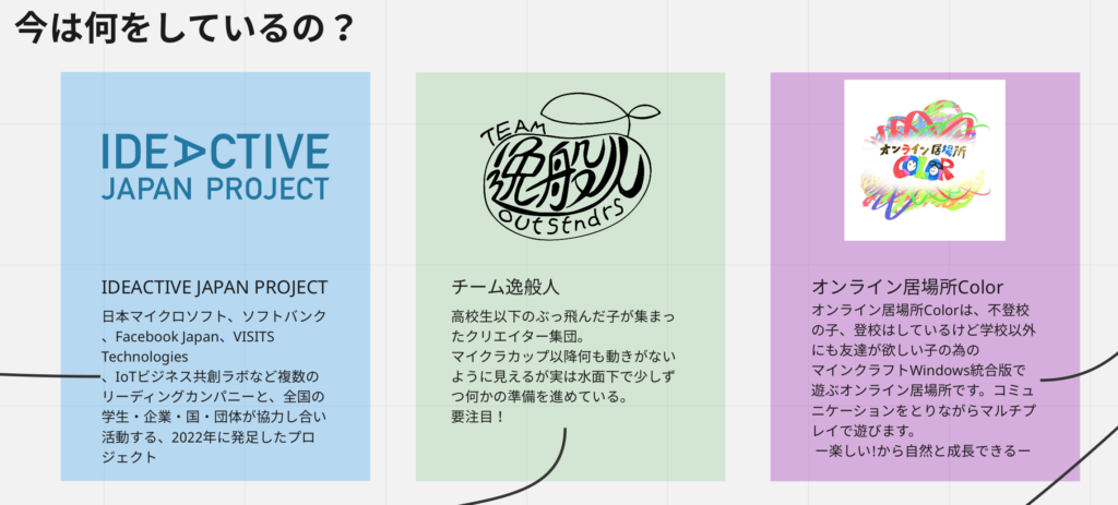 大会終了後もメンバーの活動は続いていて、現在はビジネスコンテストの運営や、オンライン居場所 Color(https://coloribasyo.com/)といった活動をしているとのこと。