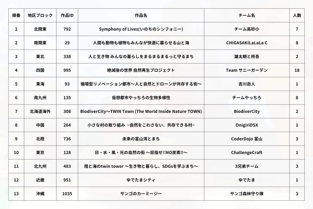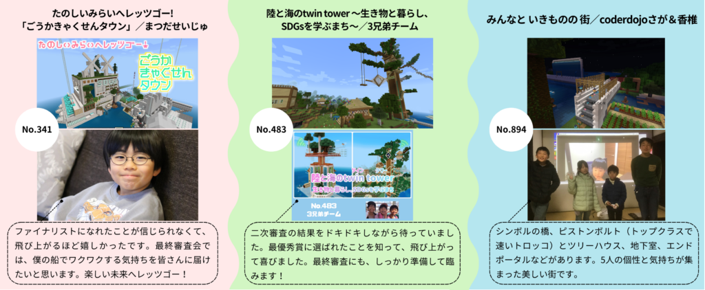 | Microsoft賞 教育版マインクラフトを通じて、自分たちの可能性を大きく伸ばすことができたチームに贈られる賞 | 日本財団賞 “One World One Family(世界は一つの家族)”といった、ダイバーシティー&インクルージョンの観点が織り込まれた作品に贈られる賞 |