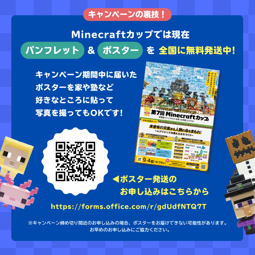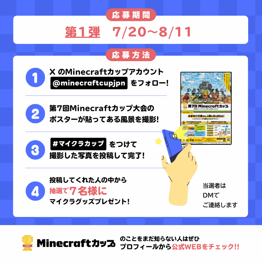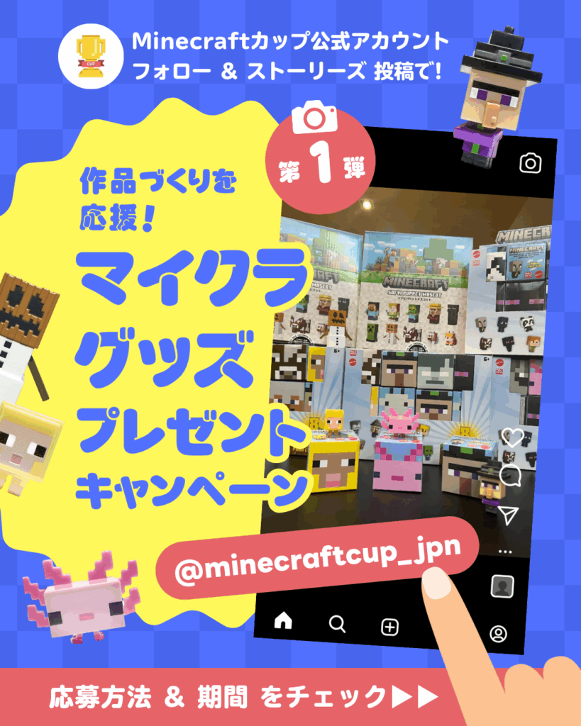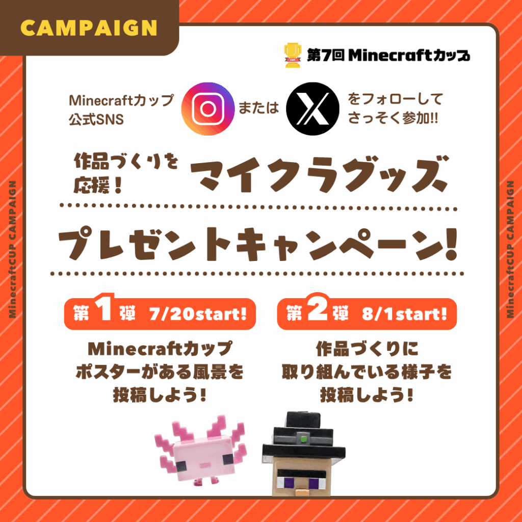 7月20日から、Minecraftカップ公式X、Instagramで「作品づくりを応援!マイクラグッズプレゼントキャンペーン」がはじまります!