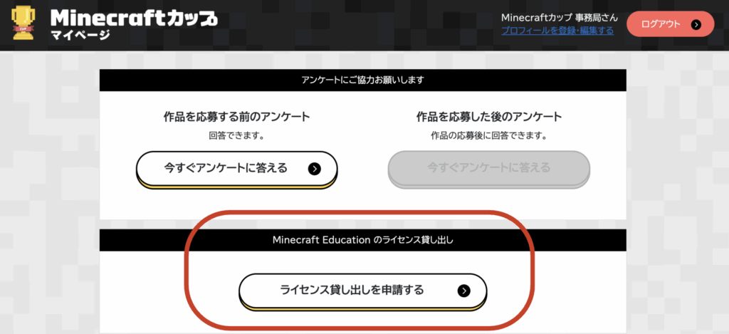 Minecraftカップ事務局では、以前より大会への会員登録後にログインできるマイページから、教育版マインクラフトのライセンス貸し出し申請を受け付けています。