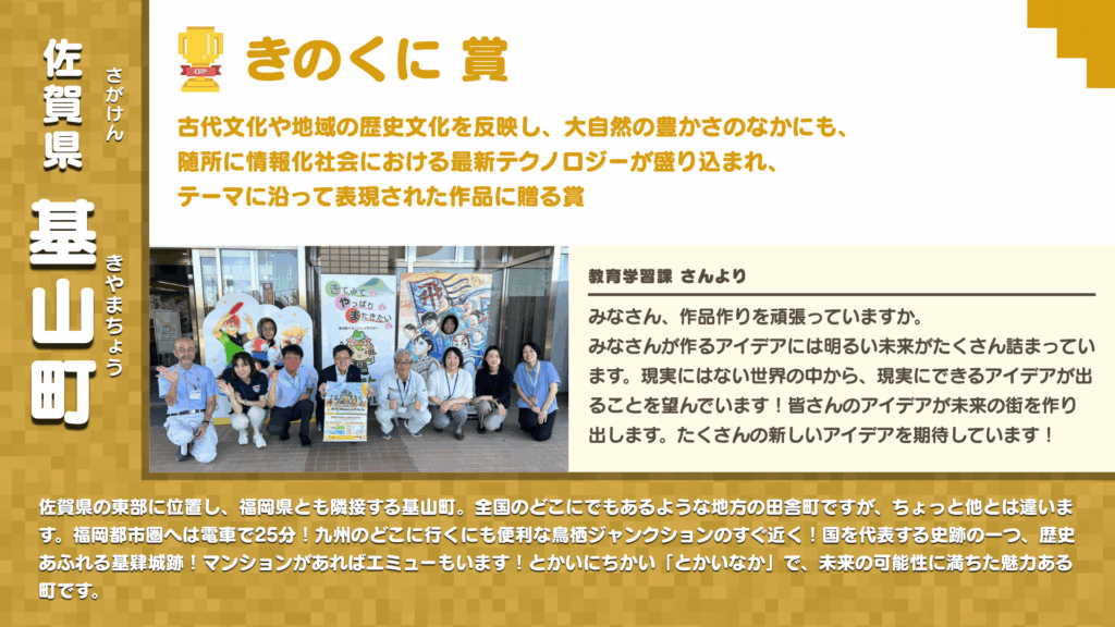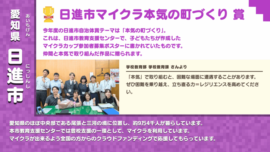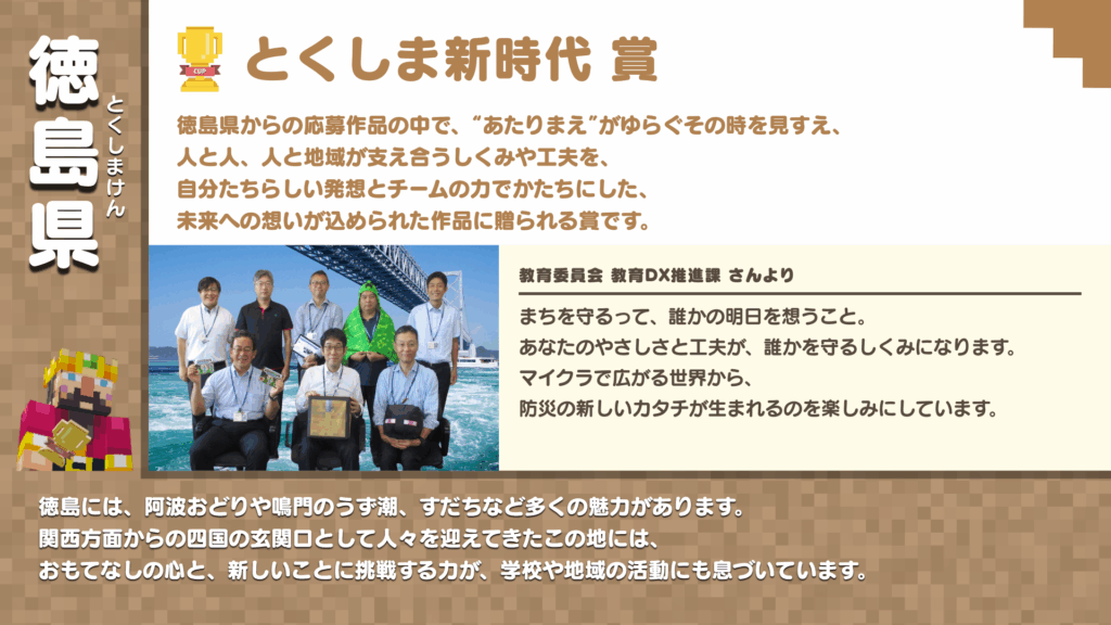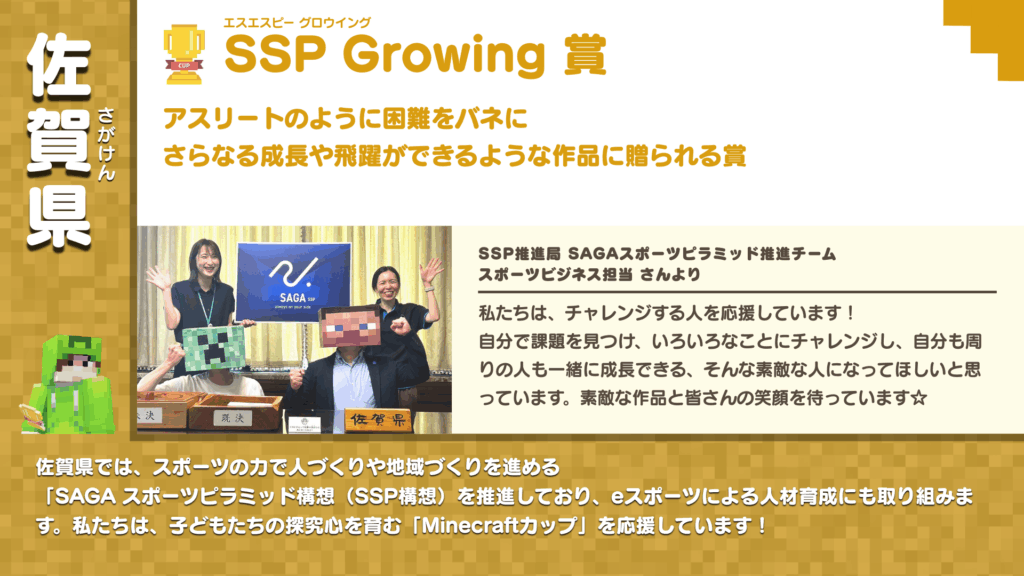 Minecraftカップでは、多くの子どもたちがデジタルものづくりや大会に挑戦できるように、自治体のみなさまに、大会パンフレットの配布や学校でのポスター掲示などの広報協力をはじめ、地区大会に出場する子どもたちへの応援を込めて「特別賞」の設置にご協力いただいています。