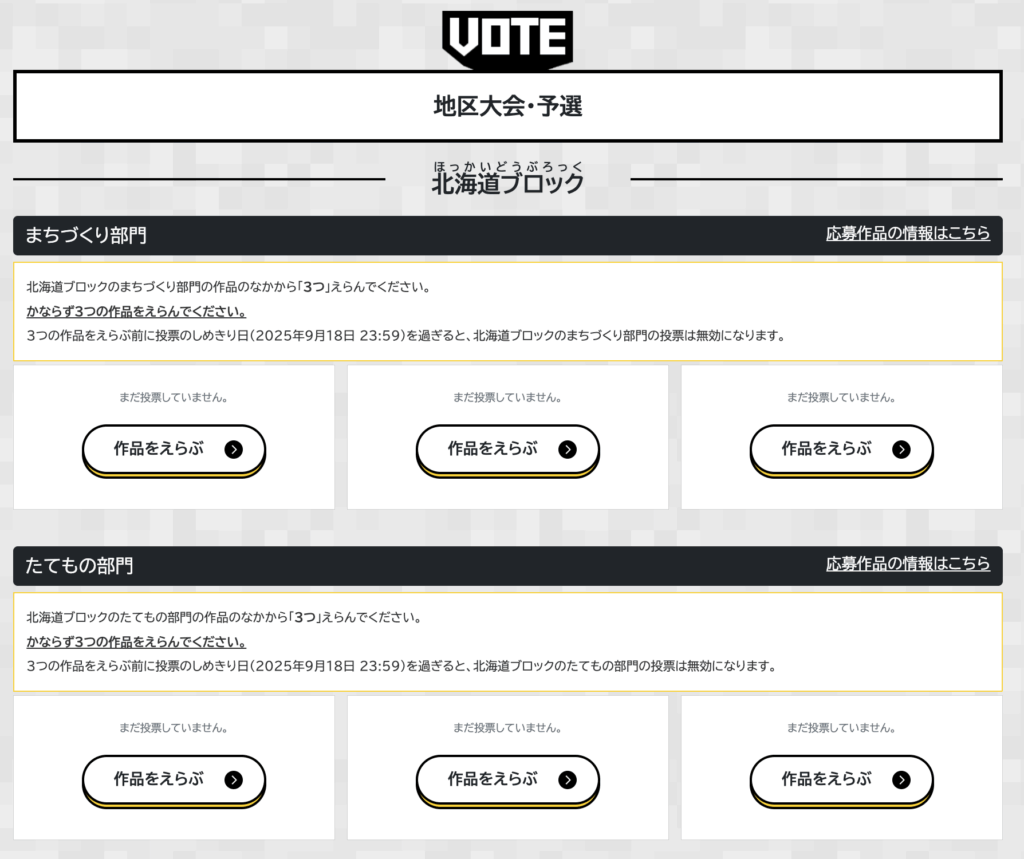 第7回Minecraftカップでは、自分が住んでいる地区ブロック以外の作品にも投票できます。