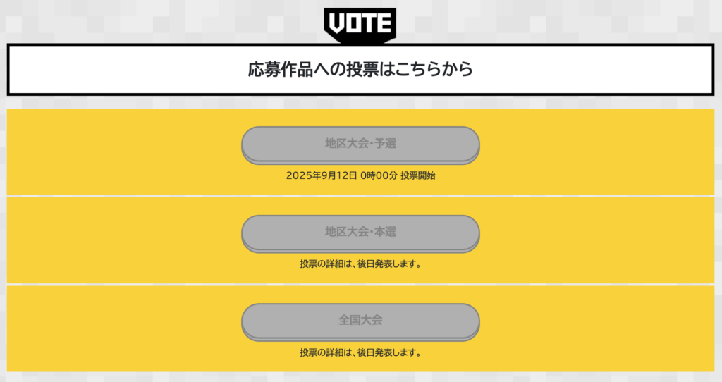 マイページにログイン後、「応募作品への投票はこちらから」の項目から「地区大会・予選」を選択し、投票画面に移動します。