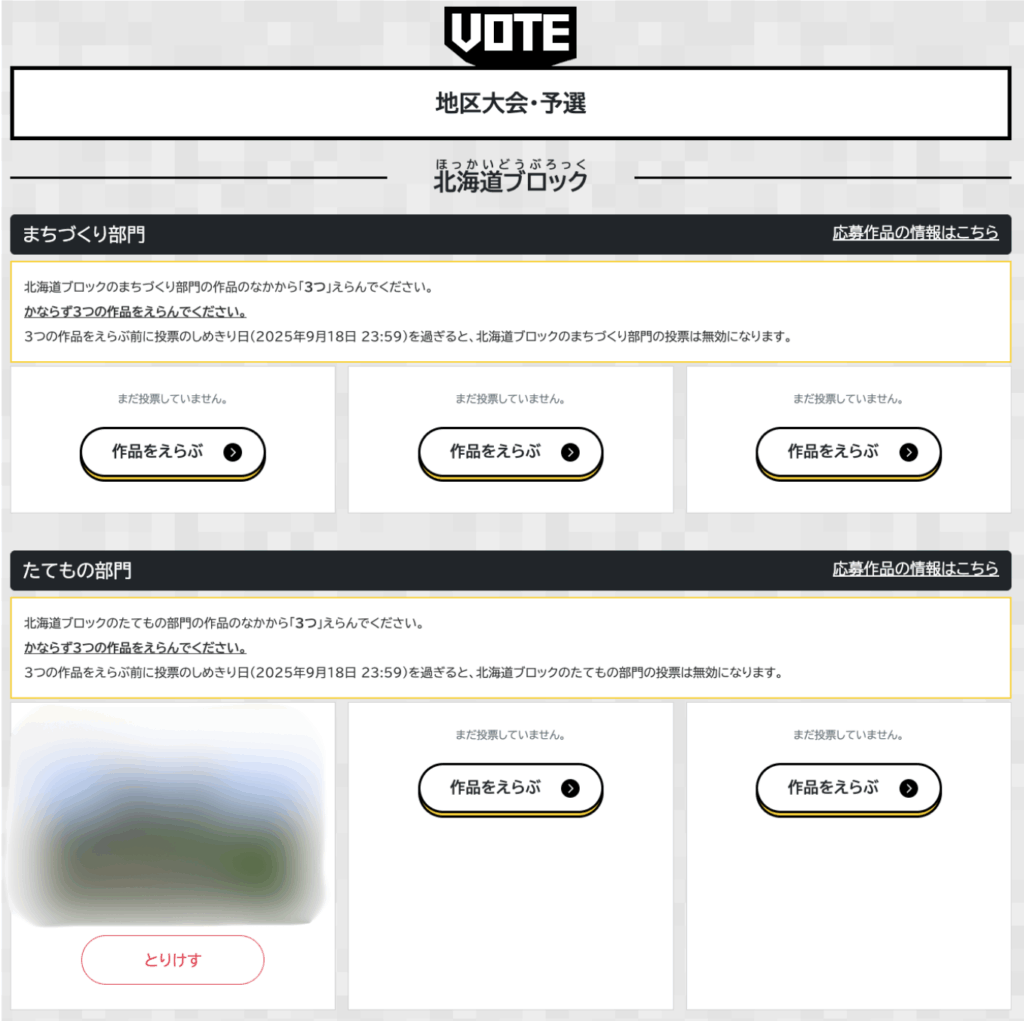 投票画面では、地区ブロックごとに「たてもの部門」「まちづくり部門」それぞれ、3作品を選んで投票します。