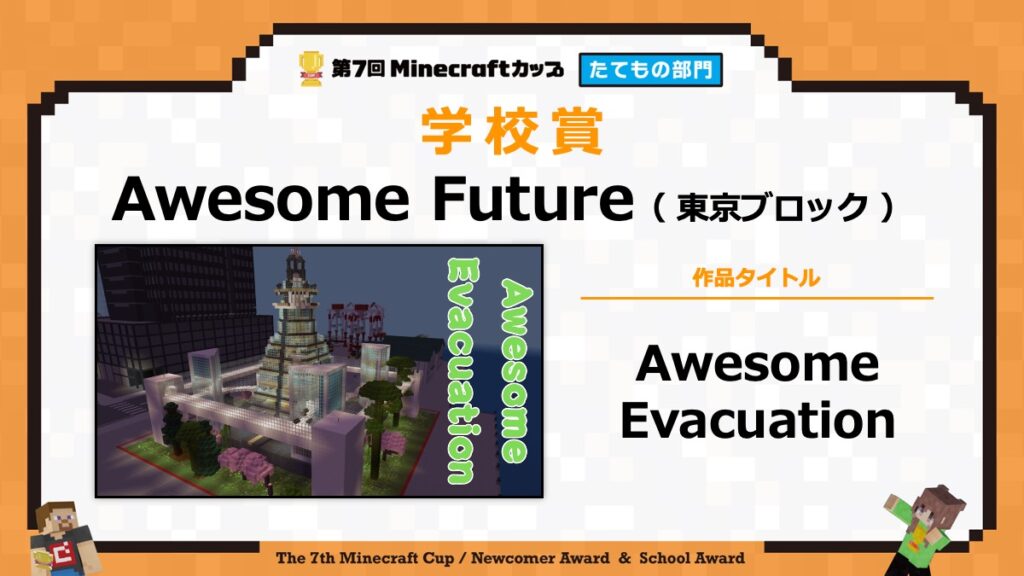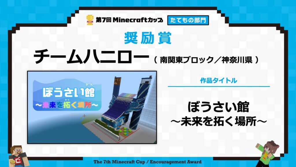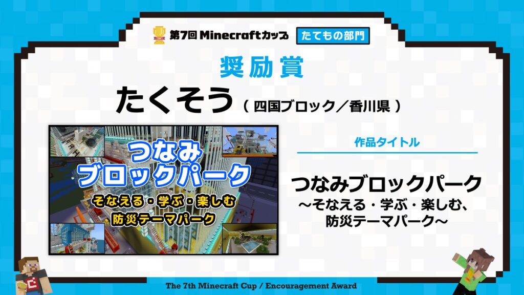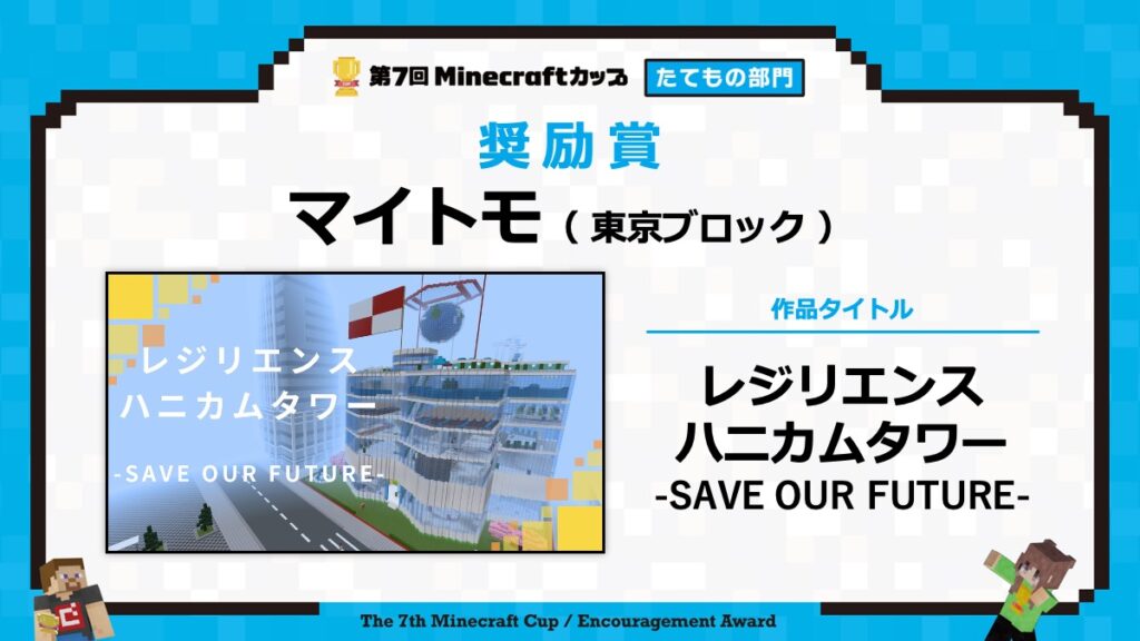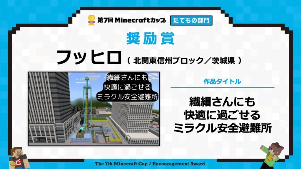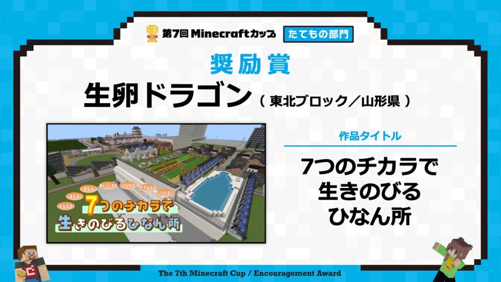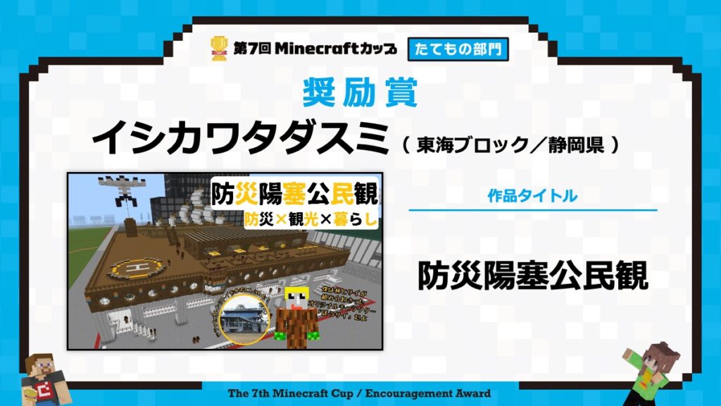 たてもの部門の表彰式は、2月15日に東京大学で行われる「第7回Minecraftカップ まちづくり部門全国大会・表彰式」と合わせて行います。