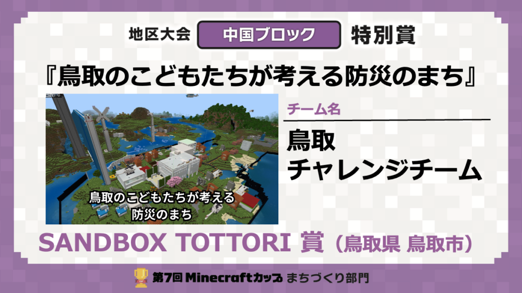 2025年12月7日に、第7回Minecraftカップ自治体パートナー「鳥取県鳥取市」にて、まちづくり部門地区大会の表彰式が行われました。