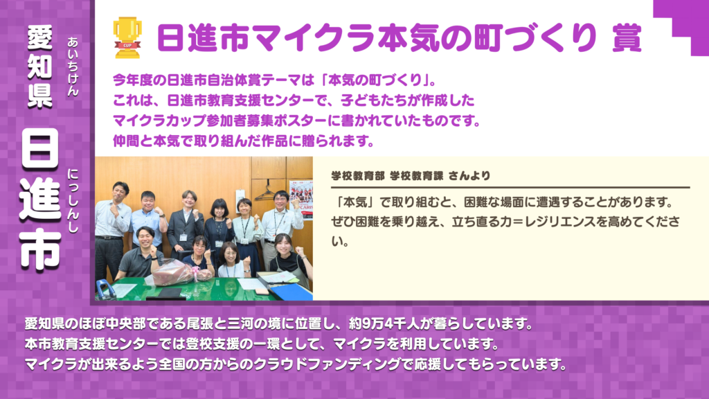 今年度の日進市自治体賞テーマは「本気の町づくり」これは、日進市教育支援センターで、 子ども達が作成したマイクラカップ参加者募集ポスターに書かれていたものです。 仲間と本気で取り組んだ作品に贈る賞