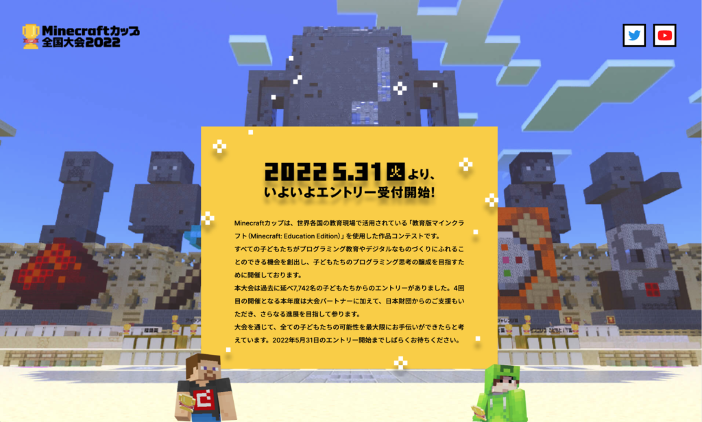 お知らせ お知らせ ティザーサイトをオープンしました お知らせ 2022.04.25 ティザーサイトをオープンしました 4月25日(月)にMinecraftカップのティザーサイトをオープンしました。 5⽉31⽇(火)よりプログラミング作品コンテスト「Minecraftカップ2022全国大会」を開催いたします。 お知らせ一覧に戻る