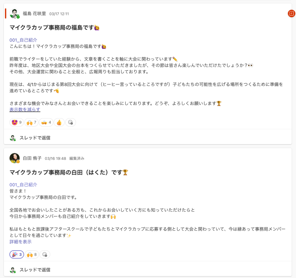 Teamsにログインし、マイクラカップ Teamsコミュニティへの参加が確認できたら、まずは [001_自己紹介]チャンネル でのごあいさつをお願いしています。
