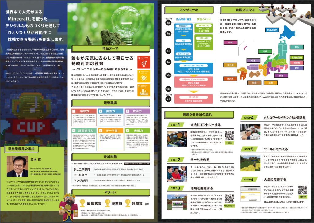 学校やプログラミング教室などでの配布に協力いただける方は、下記フォームからの申し込みで、Minecraftカップ事務局より大会パンフレットを無料発送いたします。