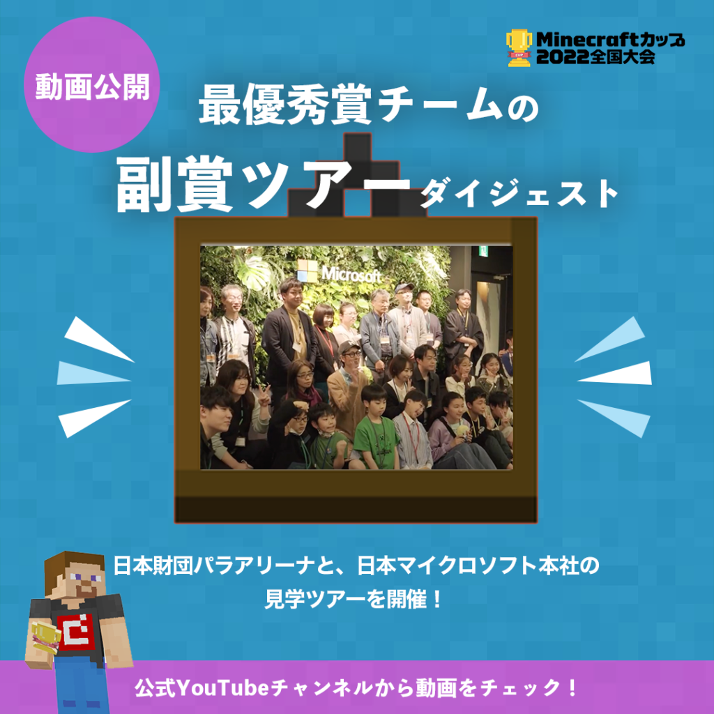 昨年度大会(Minecraftカップ2022全国大会)で、最優秀賞を受賞したチームの副賞として、2023年4月に日本財団パラアリーナと、日本マイクロソフト本社の見学ツアーを行いました。