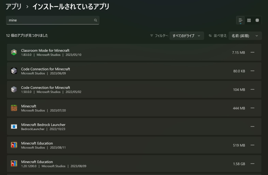アンインストールが完了するとインストール済みのアプリのリストからMicrosoft Store版が消えますので教育版マインクラフトを確認してサインインできるかどうか確認してみてください。無事にサインインできれば問題は解決です。