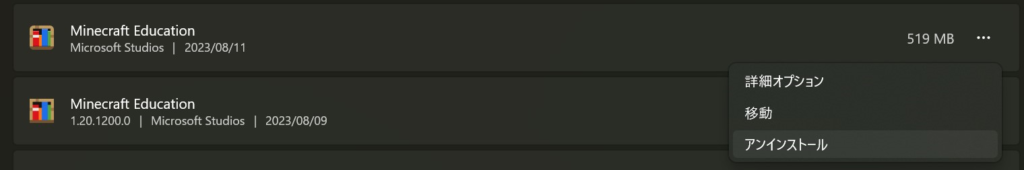 以下のように2つの教育版マインクラフトが出てきたら後からインストールした方をアンインストールします。このスクリーンショットの事例では上の方(マインクラフトのアイコンの角が丸くなっている方)が後から入れたMicrosoft Store版ですのでこちらをアンインストールします。