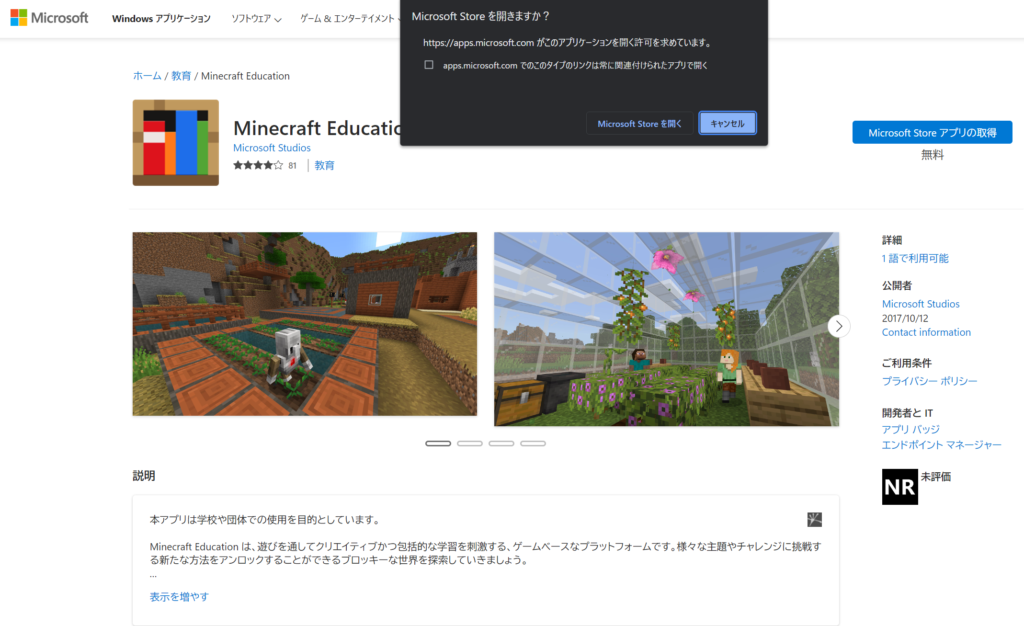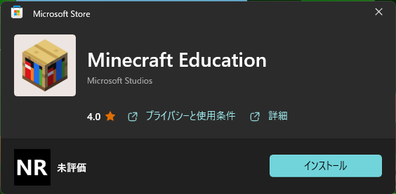 ここで「Microsoft Storeを開く」をクリックすると以下のウィンドウが開き、「インストール」をクリックするとインストールされるのはMicrosoft Store版の教育版マインクラフトになります。