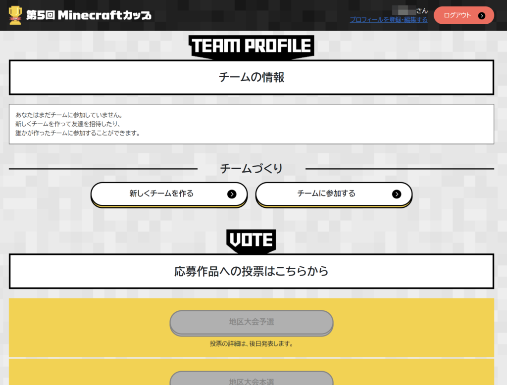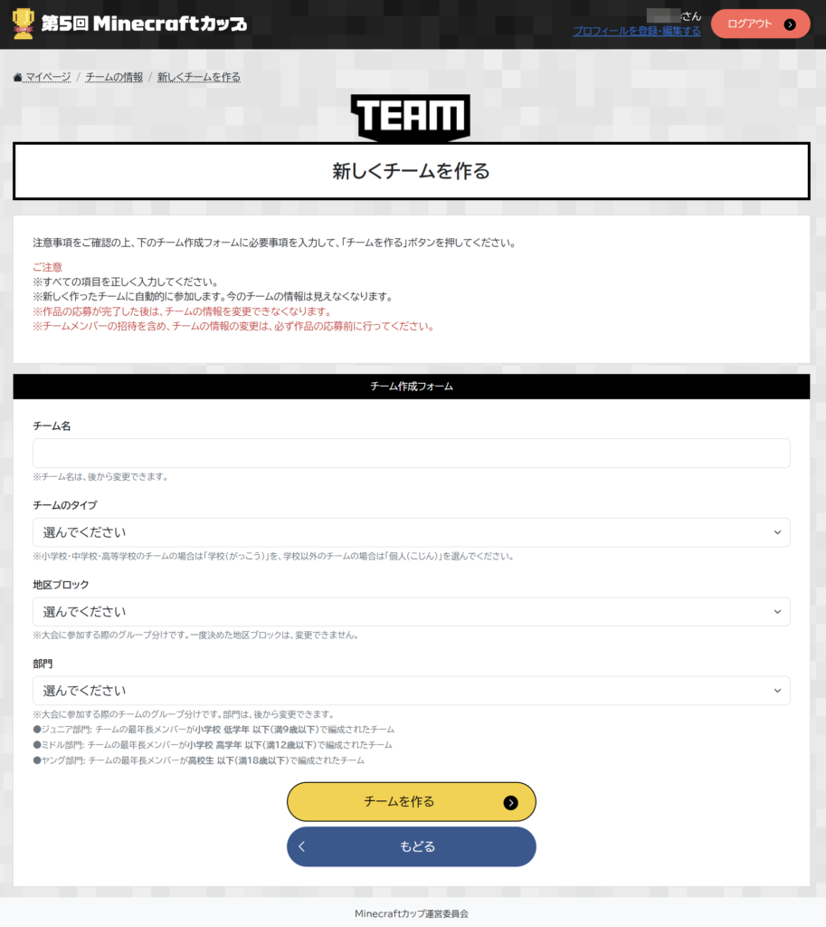 マイページにログイン後、チームづくりの下にある「新しくチームを作る」もしくは、「チームに参加する」から、チームを作成してください。
