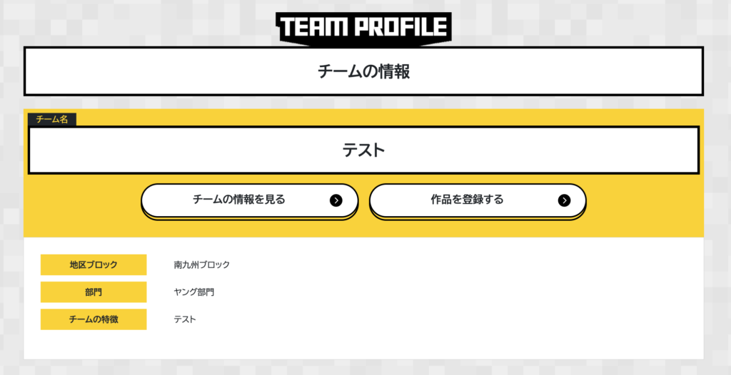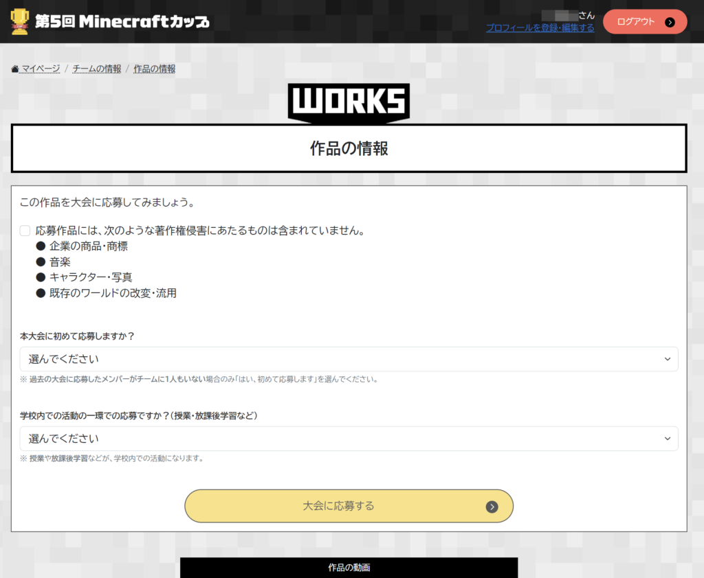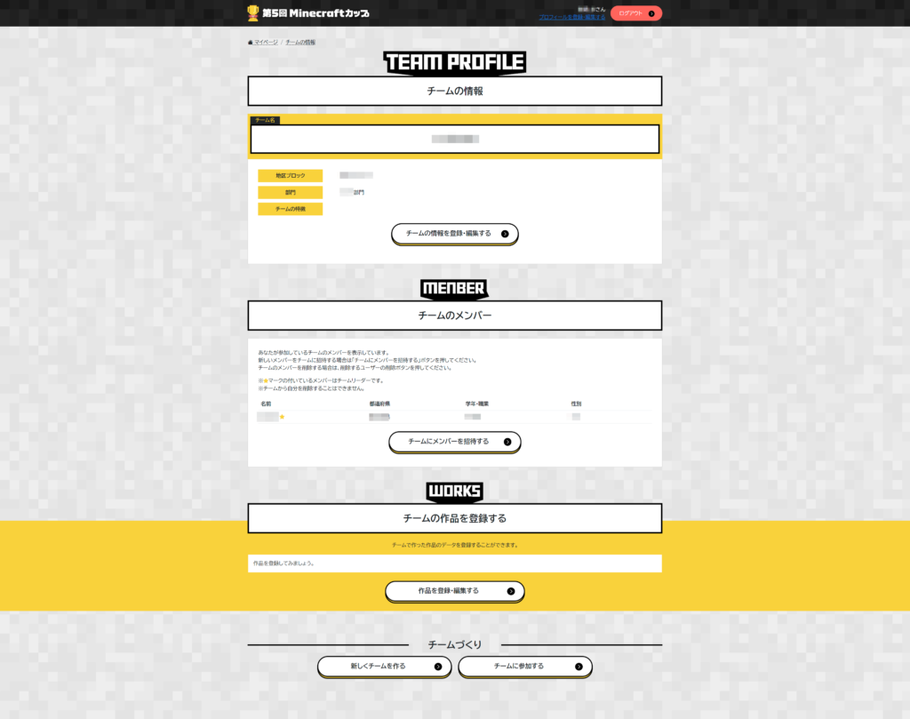 すでにチームの作成が完了している場合は、マイページにログイン後、チームの情報の下にある「作品を登録する」を選択。