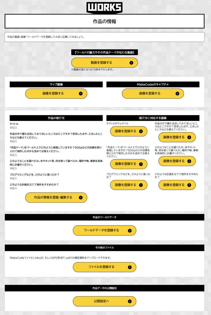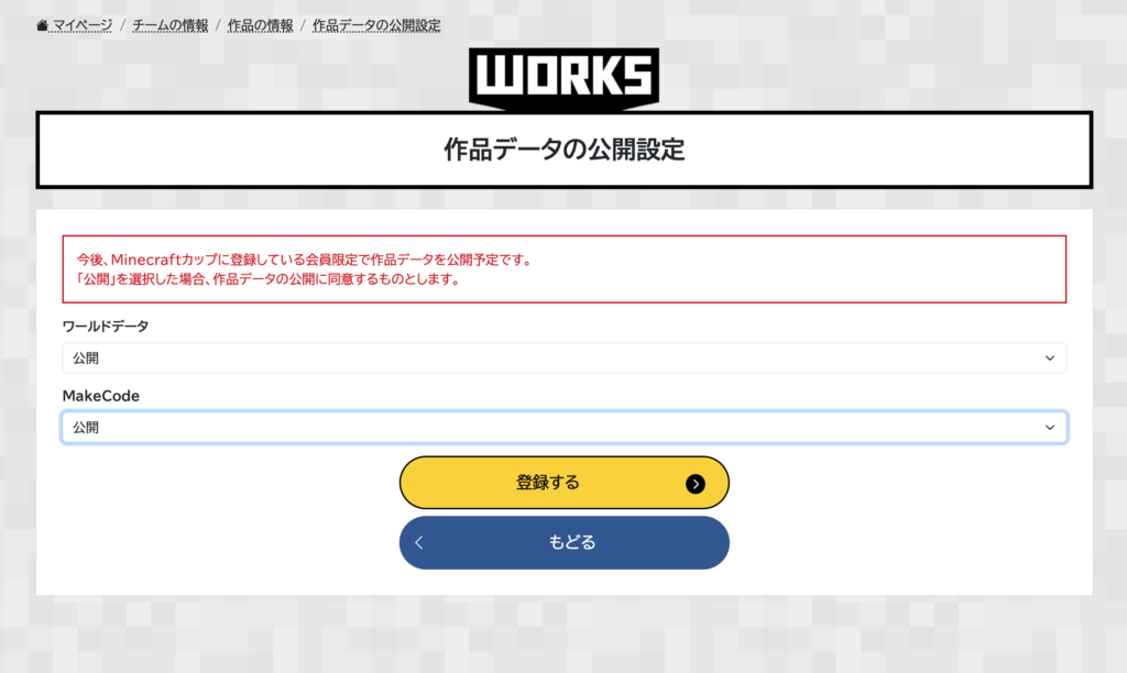 こちらは、Minecraftカップに登録している会員限定で作品データを公開する際に、アップロードいただいた作品のデータを「公開」してもよいか、もしくは「非公開」にするかを選択する画面になります。
