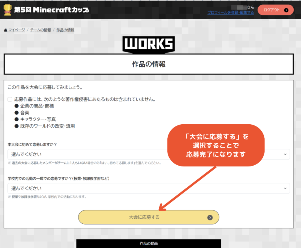 マイページから作品を登録していても「大会に応募する」ボタンを選択していない場合、作品を提出したことにはなりませんので、ご注意ください。
