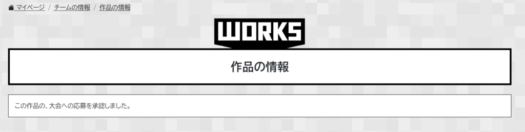 無事に作品の応募が完了して、大会から承認されている場合は、マイページの作品情報のページに「この作品の、大会への応募を承認しました」という文字が表示されています。