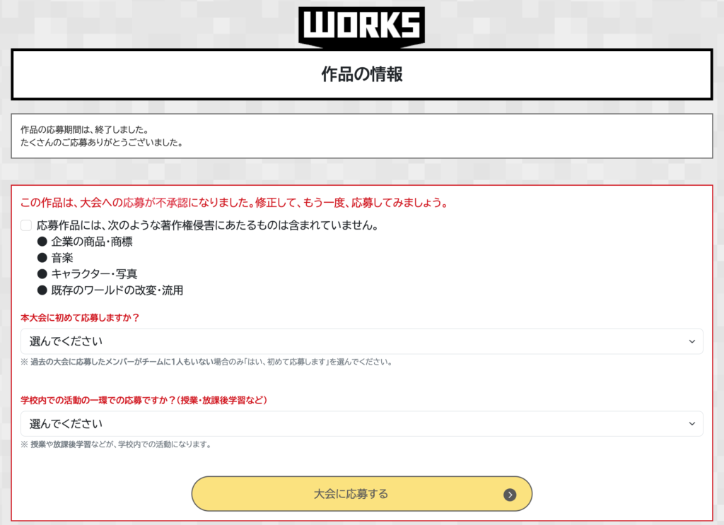 作品の応募が完了したものの、未承認になっている場合は、下記の画面のような表示になっています。この場合は、作品を修正して再登録し、もう一度応募してください。