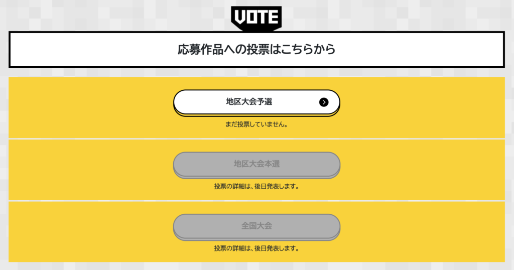 地区大会予選で投票できるのは、自分が住んでいる地区ブロックの作品のみのため、投票画面では自分が登録している地区ブロックの作品のみが表示されます。