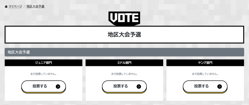 マイページにログイン後、「応募作品への投票はこちらから」の項目から「地区大会予選」を選択し、投票画面に移動します。