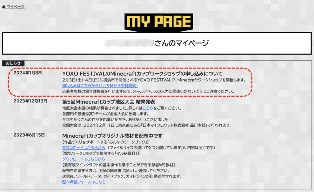 | 申し込み方法 | イベントに参加するには、Minecraftカップへの会員登録が必要です。 登録はこちらから 会員登録後に表示される「お知らせ」にある応募フォームからお申し込みください。 ![]() ※応募期間は【1月9日(火)12:00 〜 1月23日(火)12:00まで】 上記期間外のワークショップの応募受付は対応いたしませんので、お早めにお申し込みください。 ※抽選結果は、1月24日(水)に当選者にご連絡します。 |