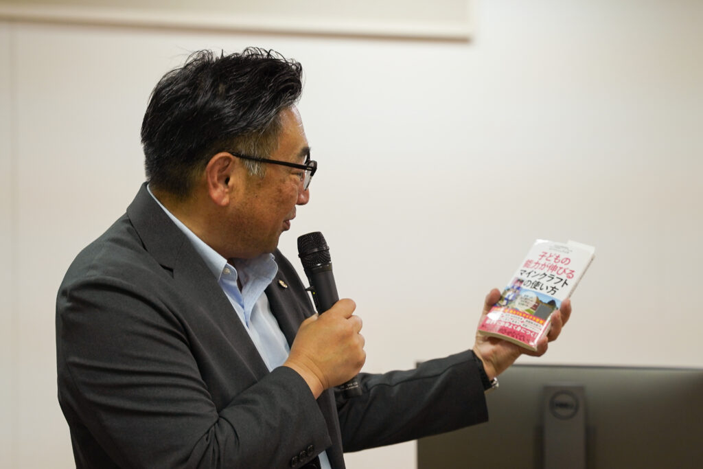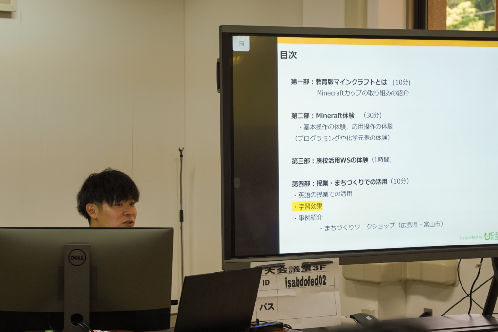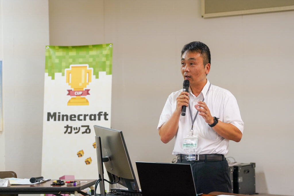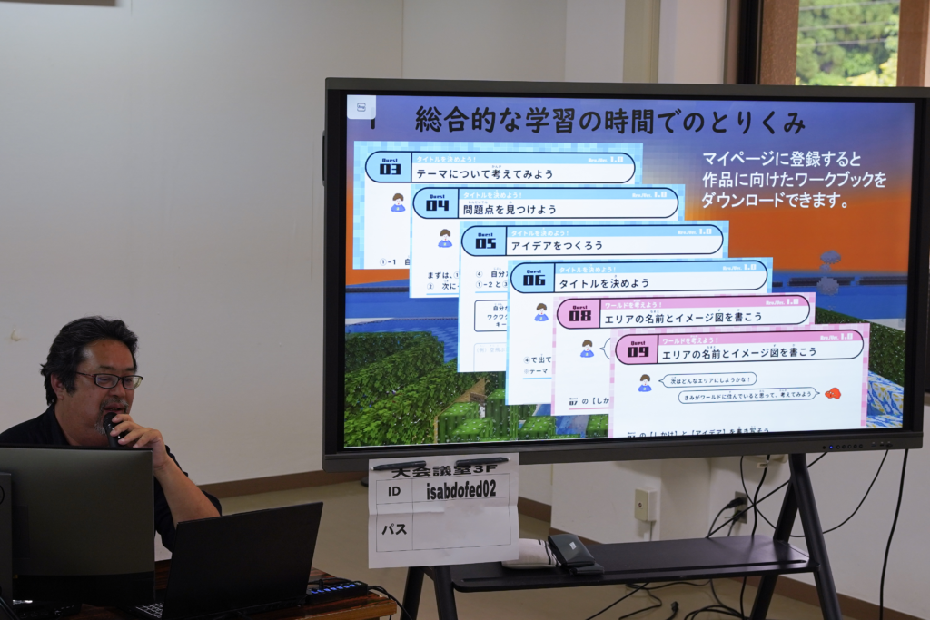 伊佐市では令和6年度の取り組みとして、市内の小・中学校あわせて9校で教育版マインクラフトの導入を予定しています。また、令和7年度には16校すべての小・中学校で導入予定とのことで、Minecraftカップ運営委員会事務局の西が操作研修・学習効果及び活用事例の紹介を行いました。