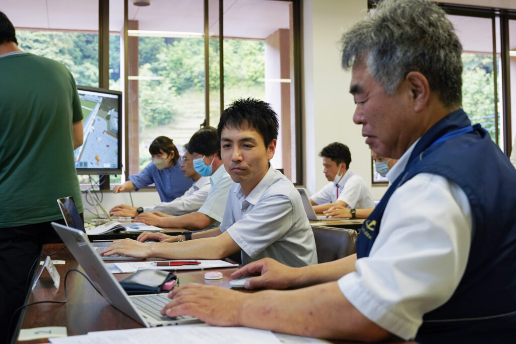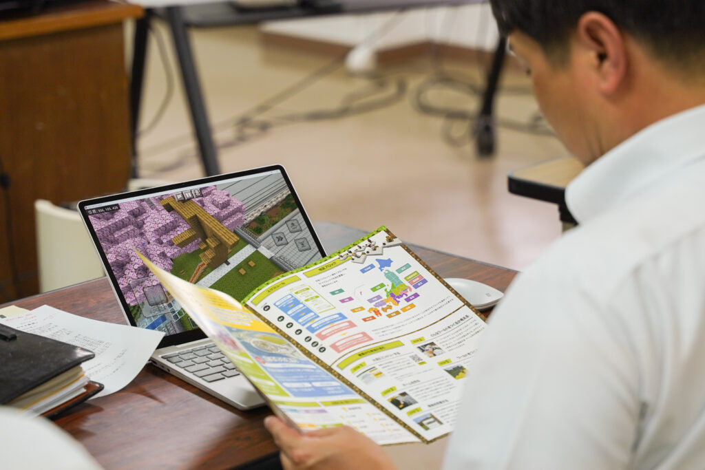 操作研修では、会場の伊佐市役所菱刈庁舎に整備された快適なインターネット回線を活用して、ひとつのワールドに複数人でアクセスして共同作業に取り組むことができるマルチプレイの体験や、オリジナル教材「廃校活用WS」を実際に体験していただくことができました。