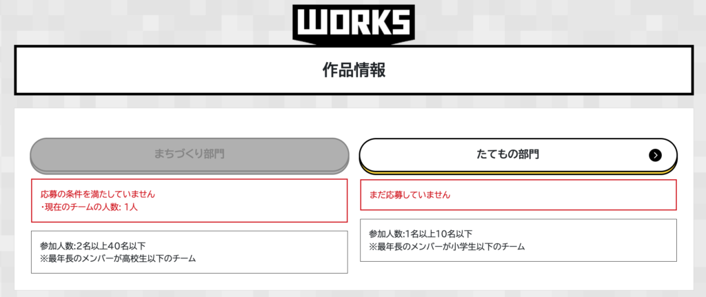 年齢やチーム人数など、応募の条件を満たしていない場合は作品の登録ができません。