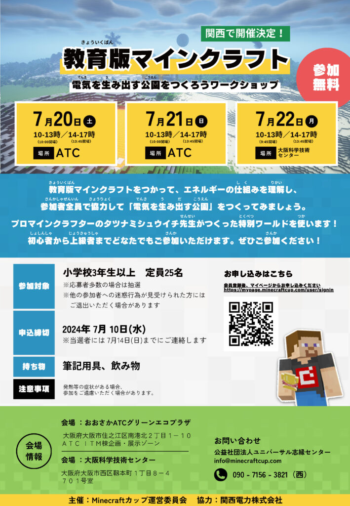 \関西の方必見!/ 7/20〜22「電気を生み出す公園をつくろう」ワークショップ参加者募集中! の「詳細・参加申し込みはこちらから」を選択し、必要事項をフォームに入力の上、お申し込みください。
