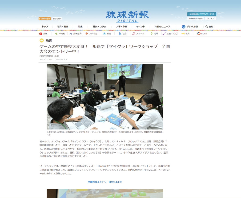 Minecraftカップ2022全国大会ワークショップキャラバン沖縄ブロック開催について、株式会社琉球新報社「琉球新報デジタル」にワークショップの実施が掲載されました。