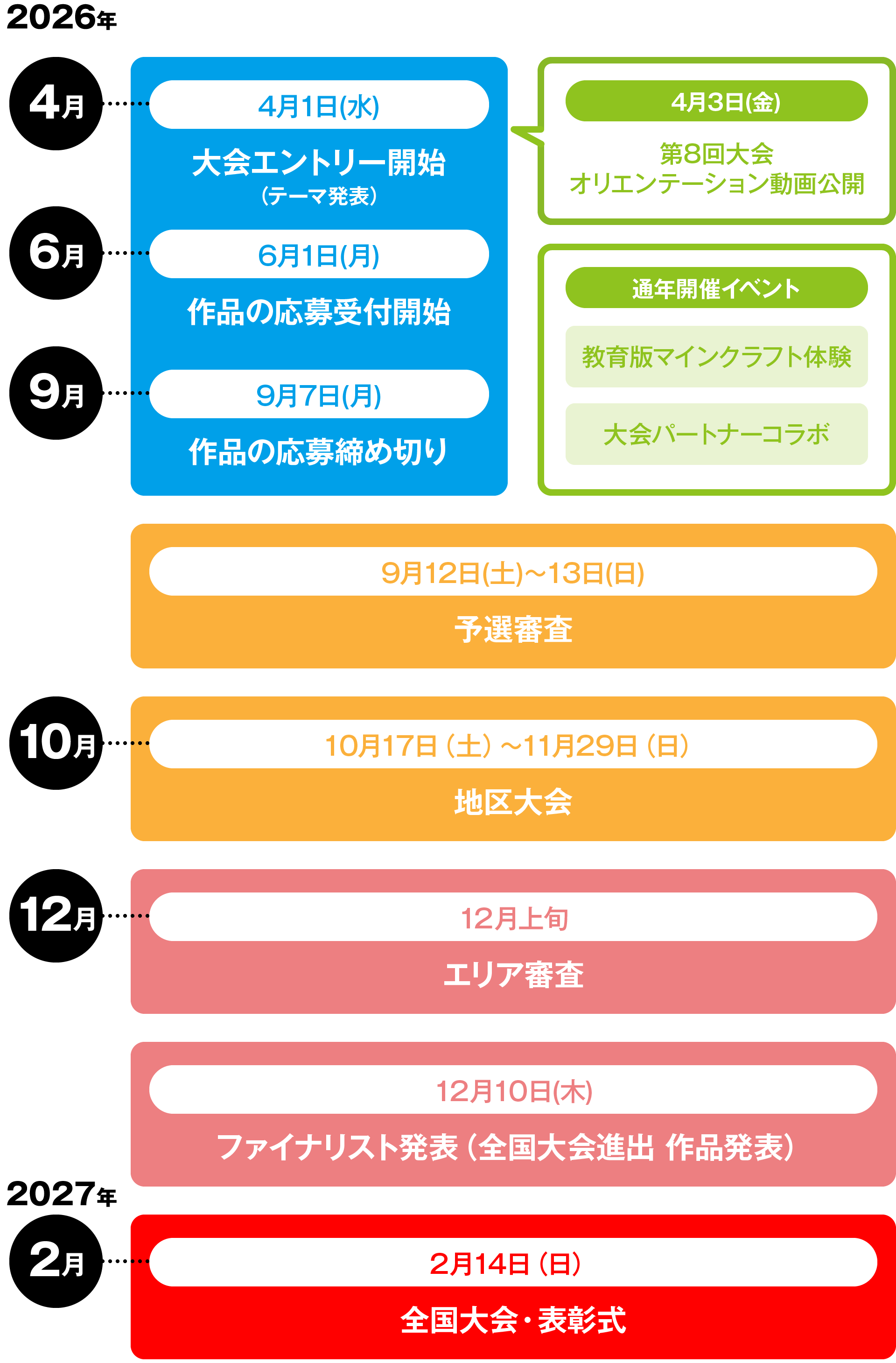 通過発表:2026年12月10日(木)19:00 大会公式YouTubeにて配信- エリアからの応募作品数に応じて、全国大会進出作品(ファイナリスト)が選出される。