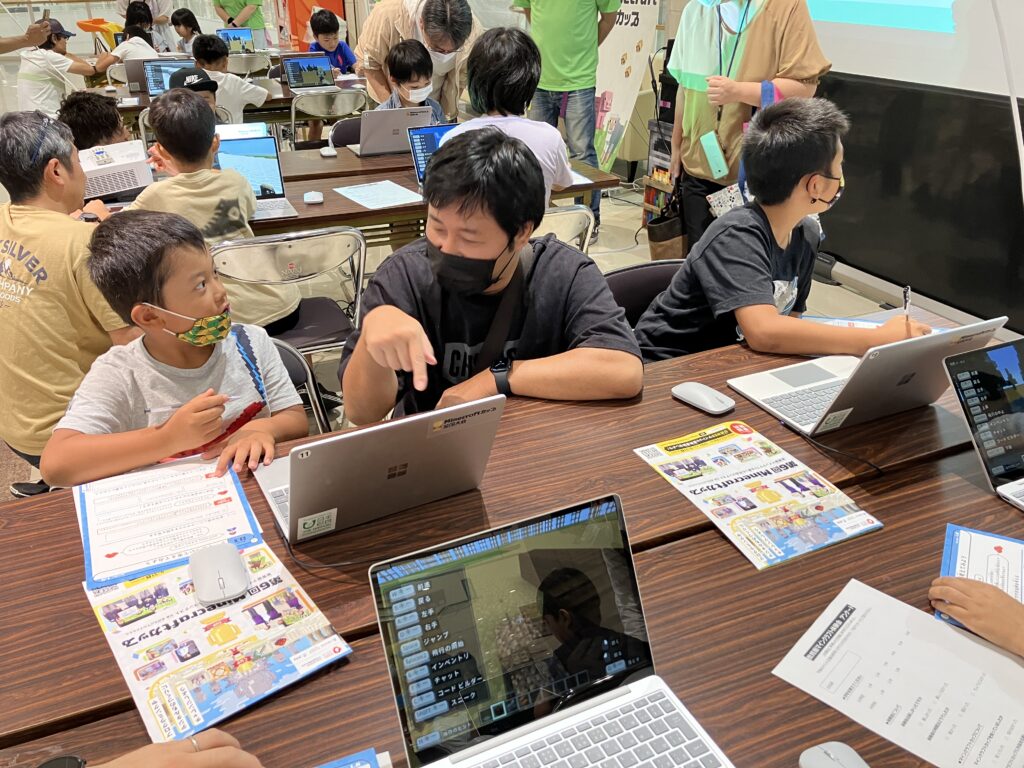 今回、子どもたちのサポートには、主催の下関市総合政策部企画課のみなさんをはじめ、地元でプログラミングやマインクラフトに取り組める場をつくっている「しものせきマイクラ同好会」のみなさんが協力してくださいました。