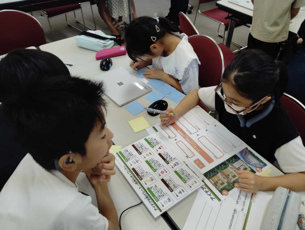 ワークショップはまず、廃校やその活用事例を学び、自分たちが作りたい施設ごとにグループをつくり、活用のアイデアを考えました。水族館、ホテル、アスレチック、植物園など、一つの廃校ワールドを舞台にたくさんアイデアが生まれました。