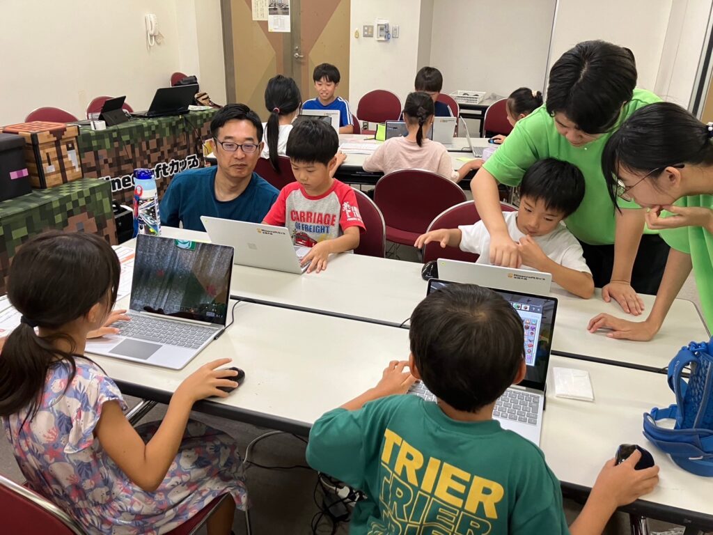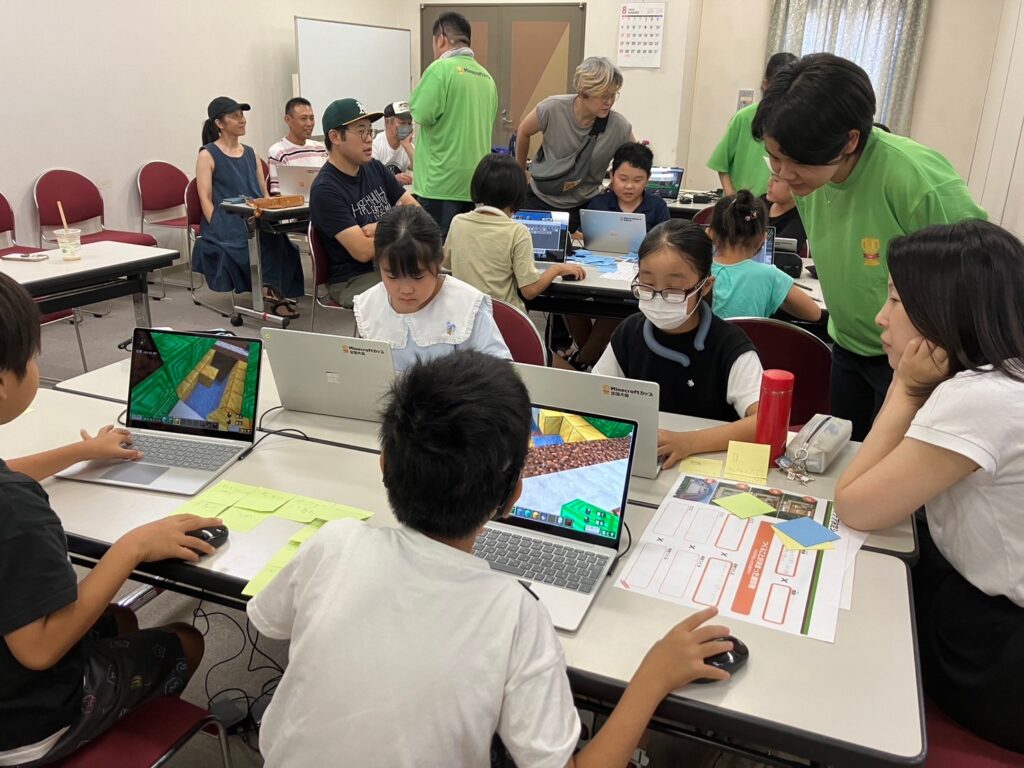 全員で同じ廃校ワールドに入り、グループごとに役割分担をしてリノベーションを行いました。保護者のみなさんにも同じワールドに入って操作してもらい、教育版マインクラフトを体験してもらいました。